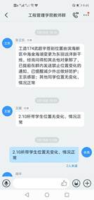 17级顶岗实习同学,是老师们最为牵挂,也是最放心不下的学生群体,虽然每位顶岗实习老师对所带学生的顶岗状况都了如指掌,但这次的疫情,学生们所在地区不同、岗位不同、周围的情况复杂程度不同,让老师们更增加一份担忧。2020年1月25日大年初一,接到分院通知,他们就开始联络学生了解实时情况。