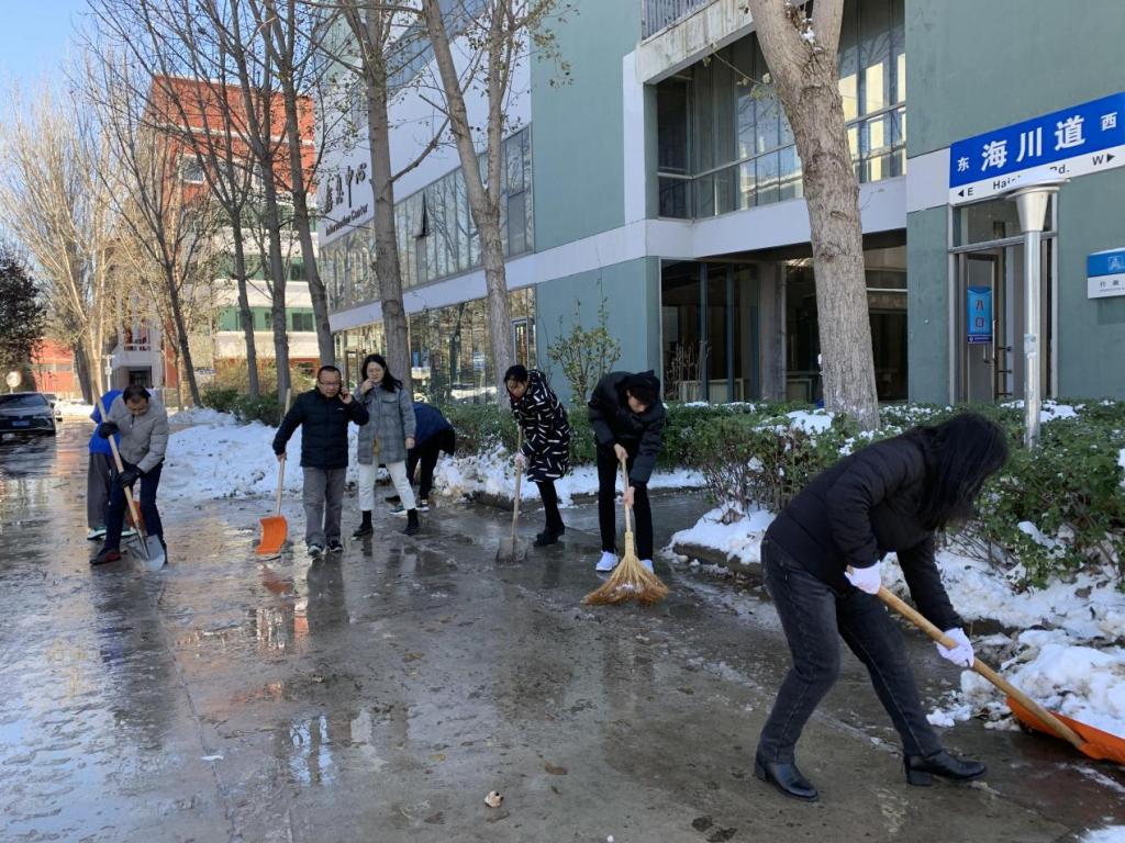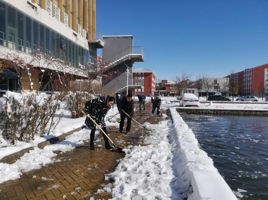 11月8日星期一一早,工程管理学院党支部带领全体党员和学生干部,对学院主干道海文道、海川道和行政楼办公区域周边进行积雪清扫。大家不畏严寒,挥舞着铁锹、扫帚,清扫院内积雪,大家你追我赶,齐心协力,配合默契,干的热火朝天,不亦乐乎,忙碌的身影构成了一道亮丽的风景线。